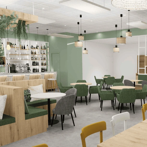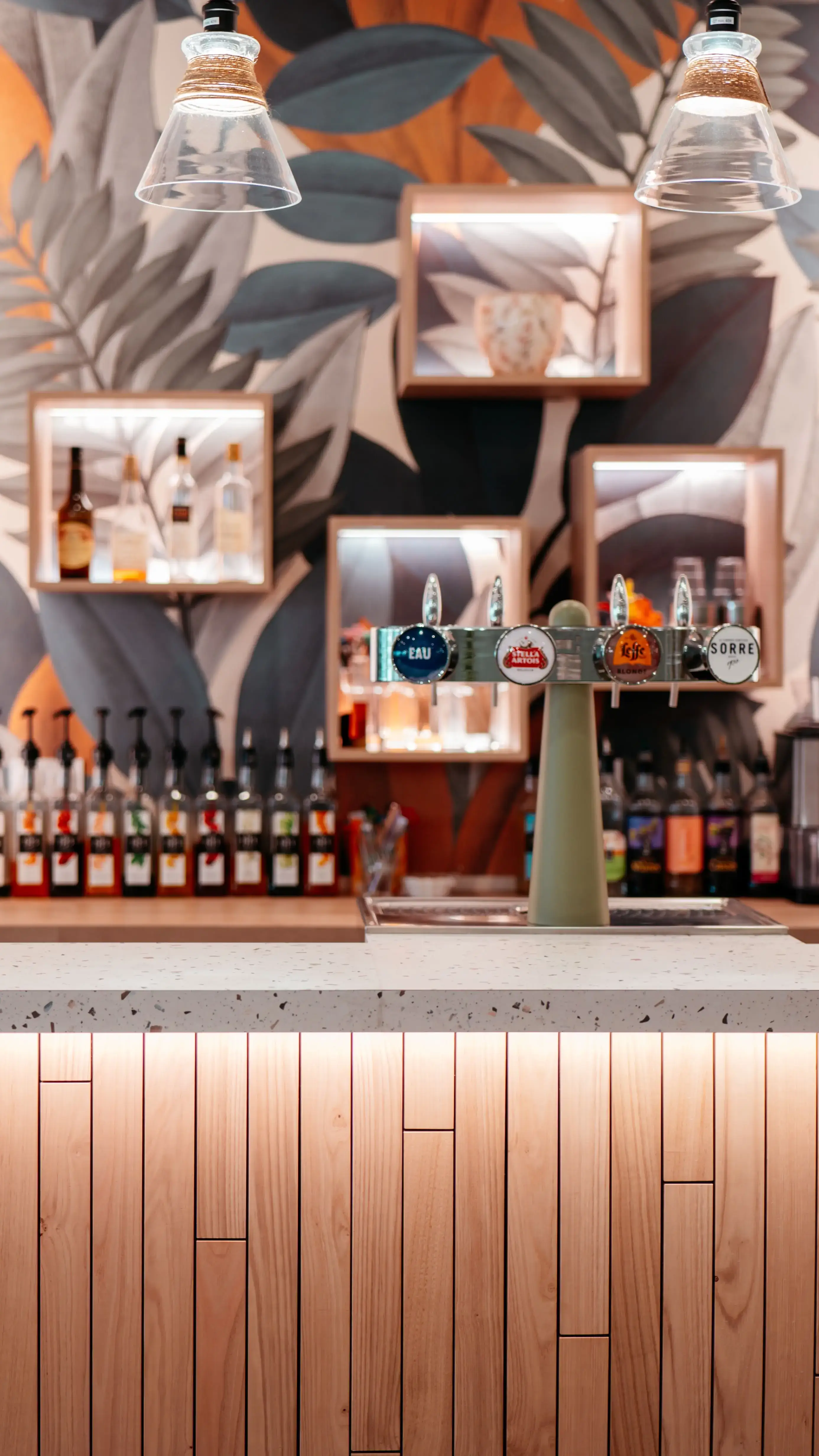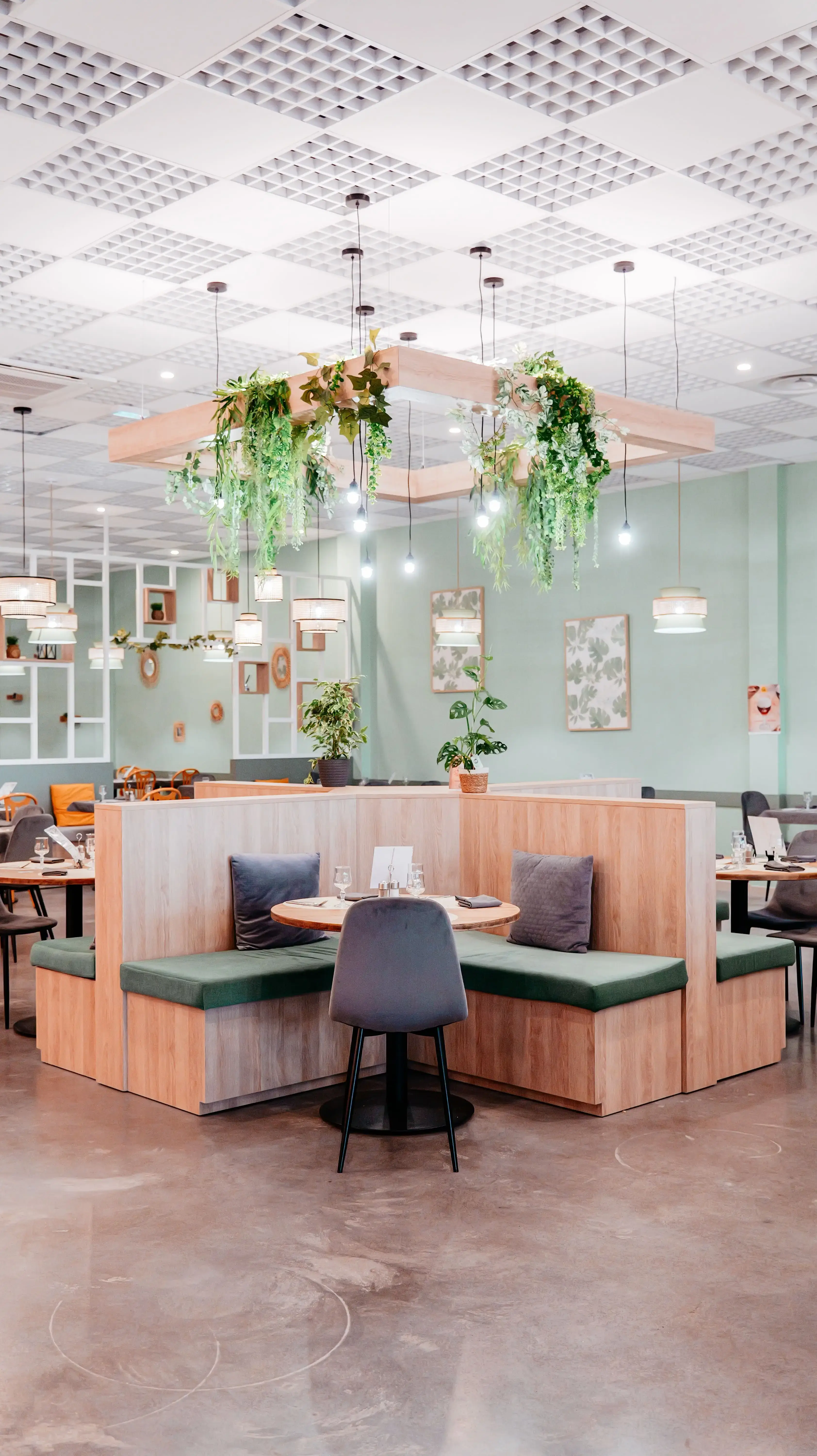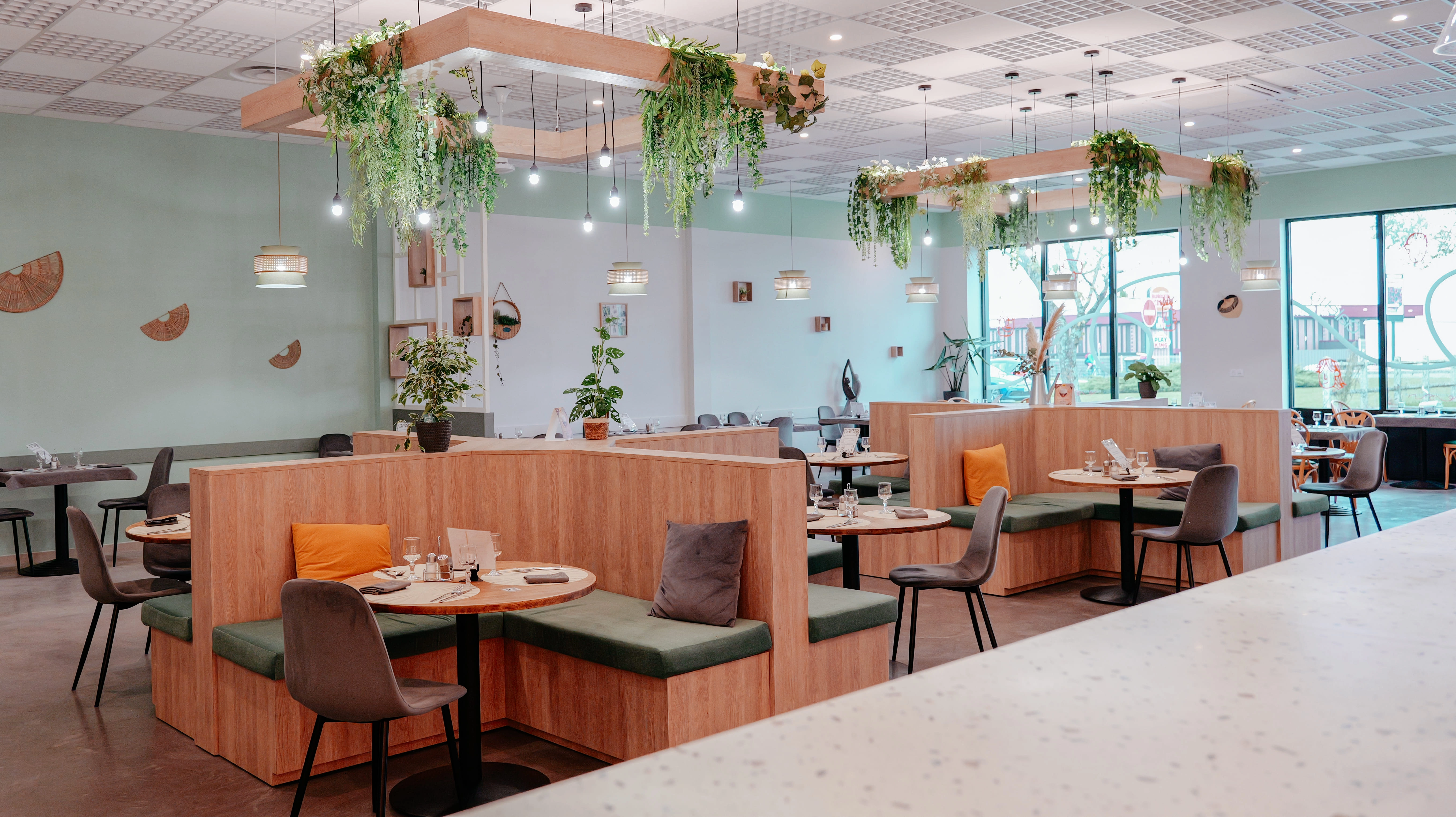 Nous avons conçu La Kitchen comme un lieu apaisant et fonctionnel, adapté à une zone passante, avec une salle plus aérée pour une circulation fluide et une ambiance accueillante.