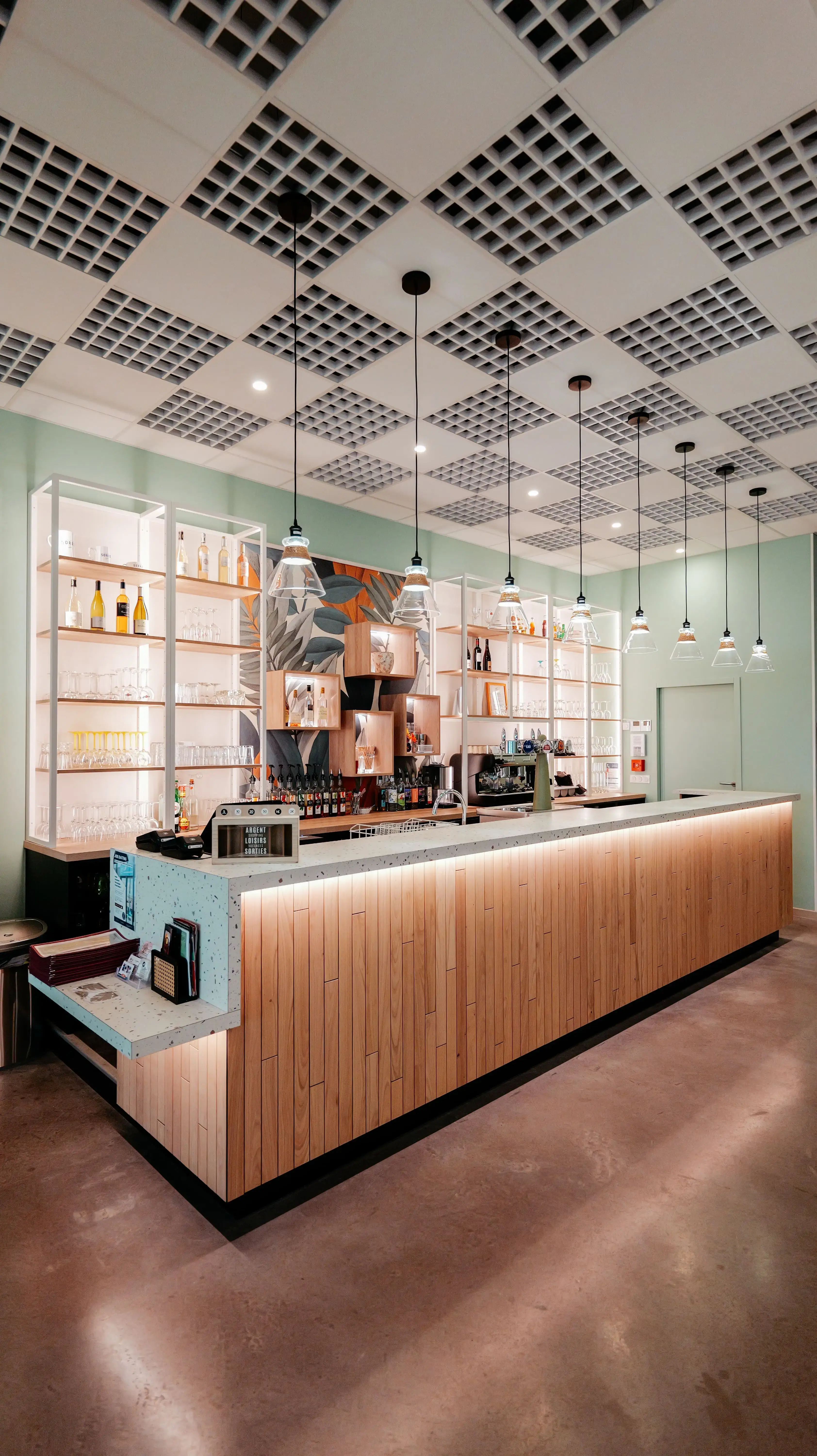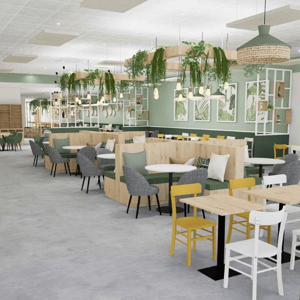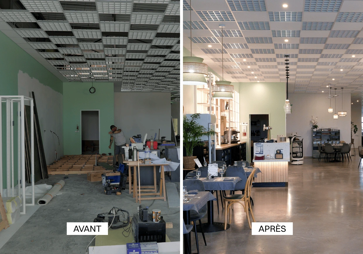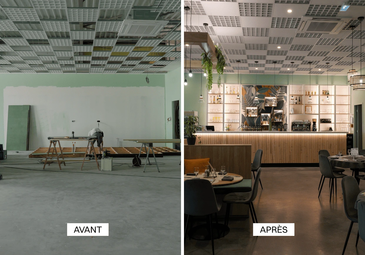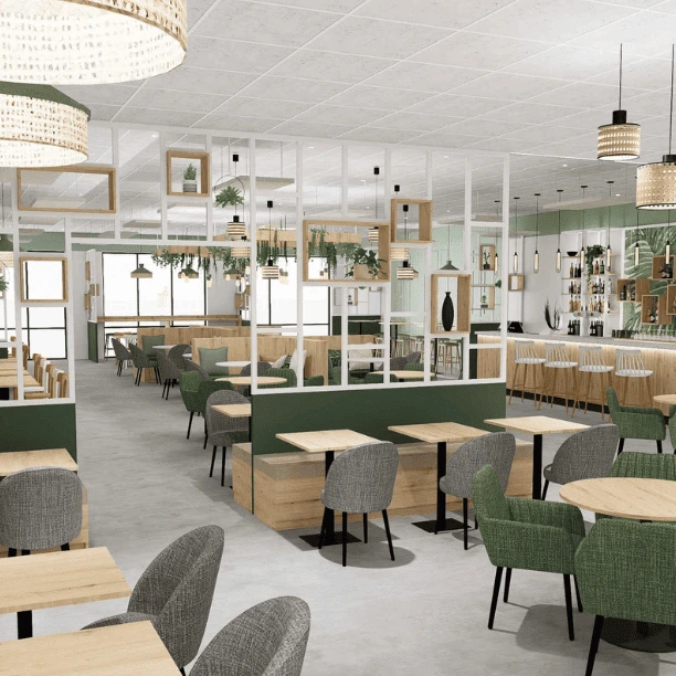 Nous avons conçu La Kitchen comme un lieu apaisant et fonctionnel, adapté à une zone passante, avec une salle plus aérée pour une circulation fluide et une ambiance accueillante.