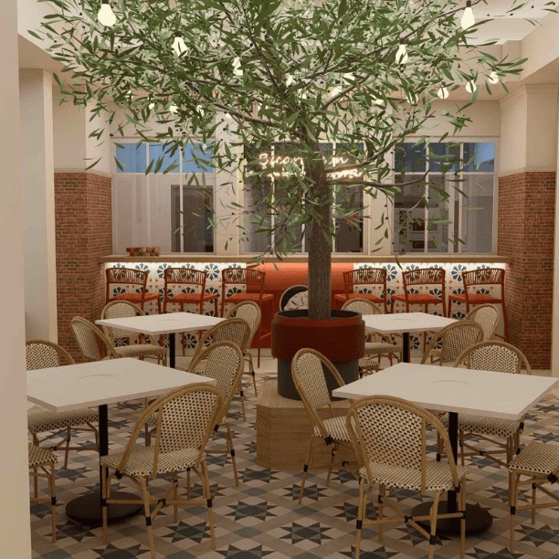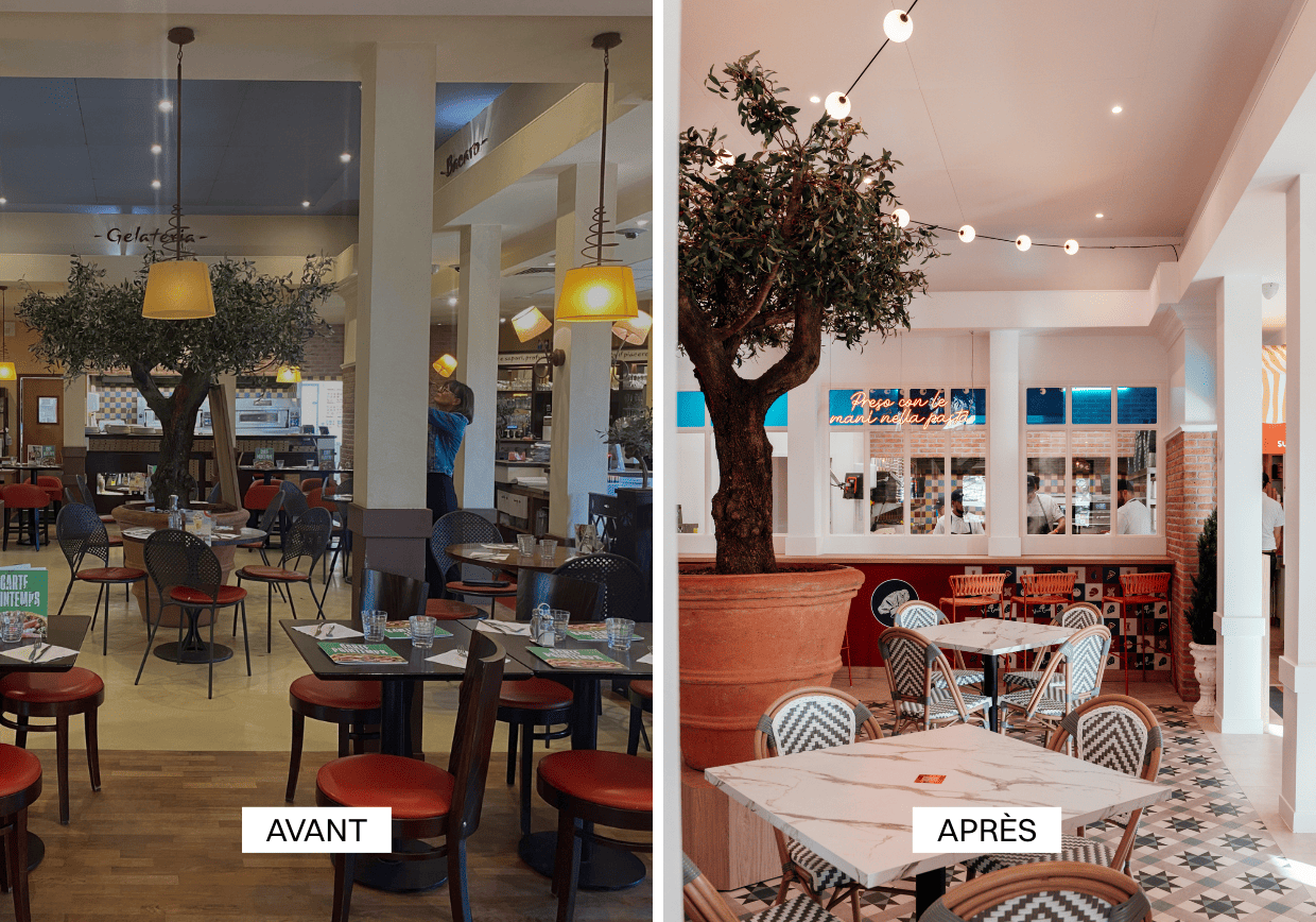 À l’intérieur, l’authenticité italienne s’exprime à travers des matériaux chaleureux, des briques apparentes, des carreaux graphiques et un mobilier bistrot revisité. Une lumière soignée met en valeur les espaces et la préparation visible, au service d’un lieu transparent et généreux.